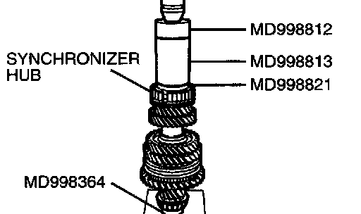 4. Using special tools MD998812, MD998813, MD998821 and MD998364, press install the 5th speed-reverse synchronizer hub with the press.
