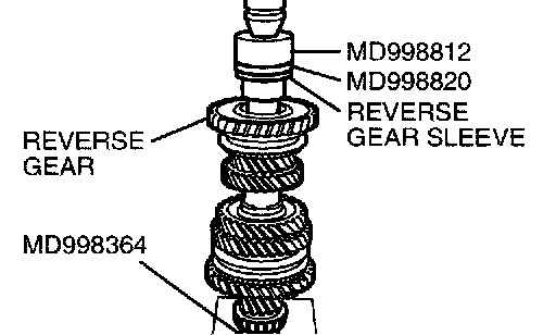 2. Using special tools MD998812, MD998820 and MD998364, press at the reverse gear sleeve. Make sure that the reverse gear and the synchronizer ring can rotate freely during the pressing process.