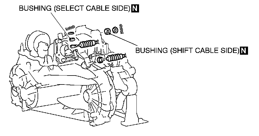^ Be careful not to damage the bushing and the bushing support at cable end when the bushings (shift cable and select cable sides) are installed.