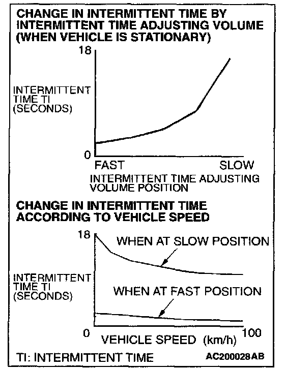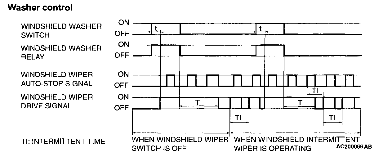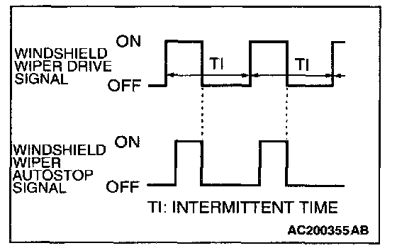 If the windshield washer switch is turned on while the windshield wiper is at intermittent mode, when the windshield washer switch is turned OFF within 0.2 second, the wiper works only once to perform mist operation by the windshield washer switch. When the ON condition of the windshield washer switch continues more than 0.2 second, the wiper performs the same movement as normal condition from the time when 0.2 second has elapsed and then returns to the intermittent motion.