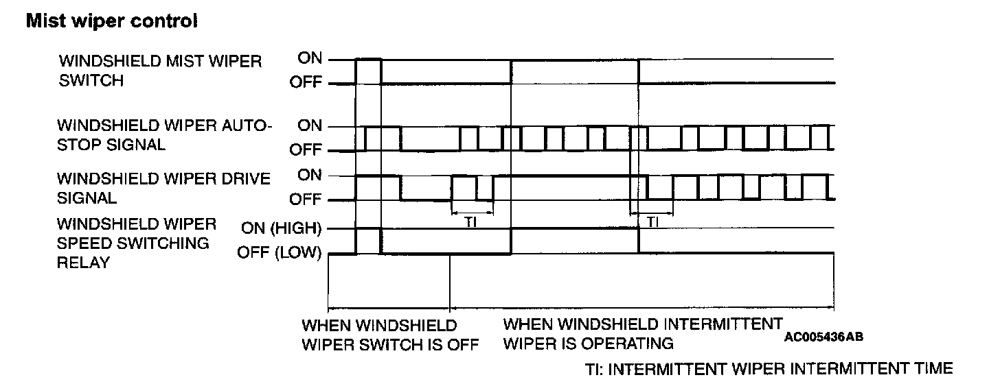 When the windshield mist switch is turned on briefly, the wiper operates at low speed once. At the point the windshield mist switch is turned ON, if the windshield wiper has been operating intermittently, the same operations as the above will be performed while the windshield mist wiper switch is ON. After the windshield mist wiper switch goes OFF, the intermittent operations will be set again T1 seconds after the windshield wiper auto-stop signal is turned ON last.