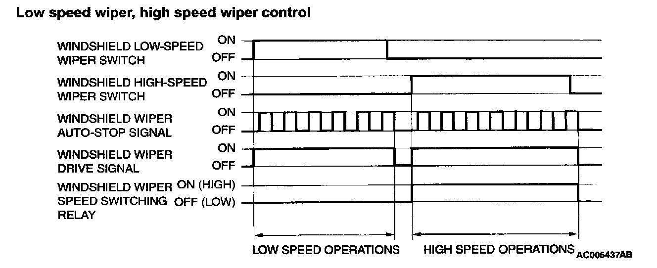 NOTE: The windshield wiper speed is changed by wiper speed control relay incorporated in front-ECU. When the wiper speed control relay is at "ON" position, the windshield wiper operates at high-speed, and the wiper speed control relay is at "OFF" position, the windshield wiper operates at low-speed.