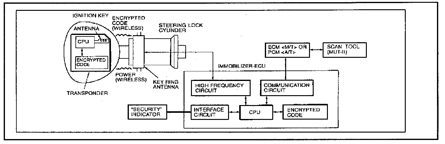 If keys are lost or if additional keys are needed, new immobilizer keys can be cut using the key code and a transponder key blank. New keys must be registered with a new ID code to operate properly with the Immobilizer ECU. Unless there are at least 2 original keys, all keys, both new and existing, must be registered using the MUT-II or MUT-III (refer to SECTION B, Immobilizer Ignition Key Registration Procedures elsewhere in this bulletin).