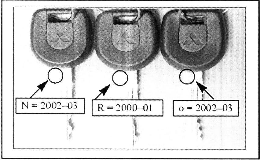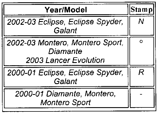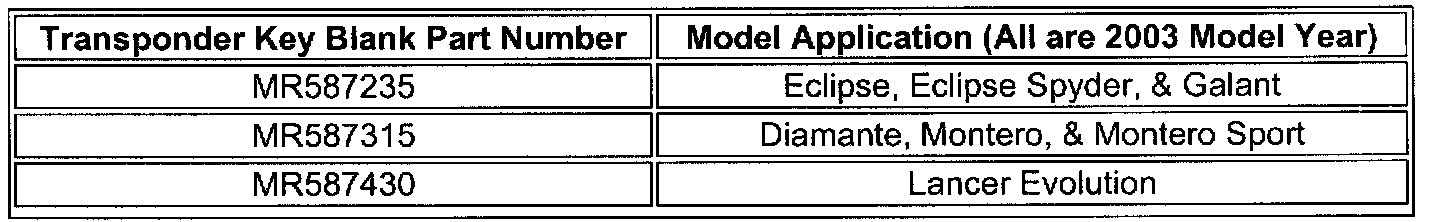Using the wrong transponder key blank will cause fault codes to set in the PCM. For 2002-03 Eclipse, Eclipse Spyder, and Galant, use key blanks stamped "N". 2002-03 Diamante, Montero, and Montero Sport and 2003 Lancer Evolution key blanks are marked with a small circle (although the 2003 Lancer Evolution key blank is marked in the same manner as the key blank for the Diamante, Montero, and Montero Sport, it has a different part number. Refer to the part number chart which is shown.) 2000-01 Eclipse, Eclipse Spyder, and Galant key blanks are marked "R". 2000-01 Montero, Montero Sport, and Diamante key blanks have no markings. KEY BLANKS FOR 1999 AND EARLIER MODEL YEAR VEHICLES AND KEY BLANKS FOR 2002-03 LANCER (ES, LS, OZ Rally), MIRAGE, AND 2003 OUTLANDER ARE NOT TRANSPONDER EQUIPPED AND CANNOT BE REGISTERED FOR IMMOBILIZER EQUIPPED VEHICLES.