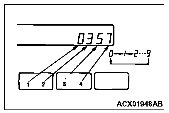 5. Press number 1 through number 4 memory select button to set the four-digit security code shown on the card. Every time each digit key is pressed, the figure changes as follows: 0 to 1 to 2 to 3 to 4 to 5 to 6 to 7 to 8 to 9 to 0