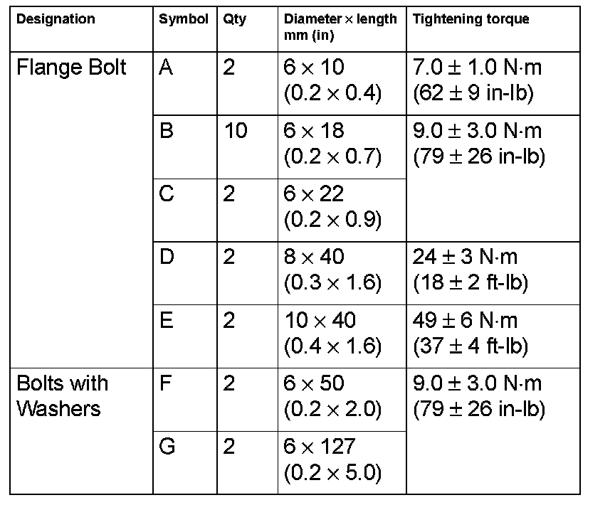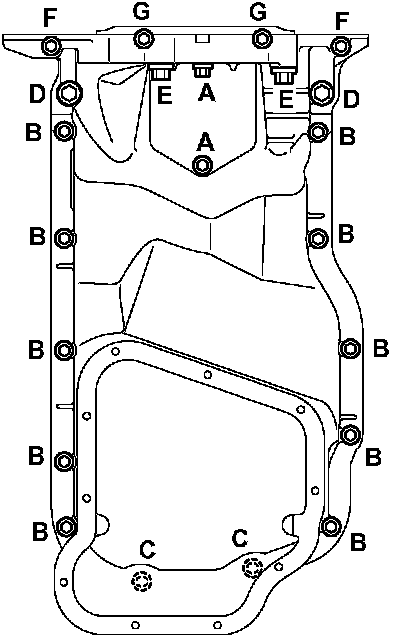 3. Using the letter symbols in the table below, install the upper oil pan using the correct bolt. Refer to the table for proper torque.