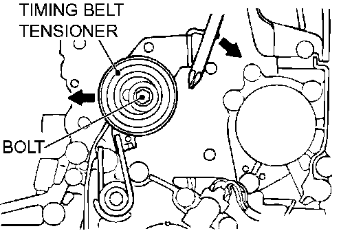 1. With the timing belt tensioner pulley bolt loosened, use a screwdriver to pry the tensioner pulley as close to the engine mount as possible. Then temporarily tighten tensioner bolt.