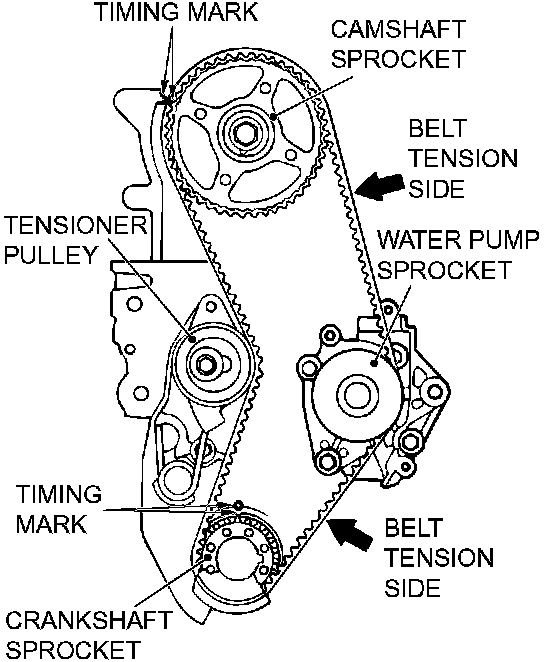 CAUTION: After installing the timing belt, try to rotate the camshaft sprocket in the reverse direction. Recheck to be sure that the belt is fully tensioned and that each timing mark is in the proper position.