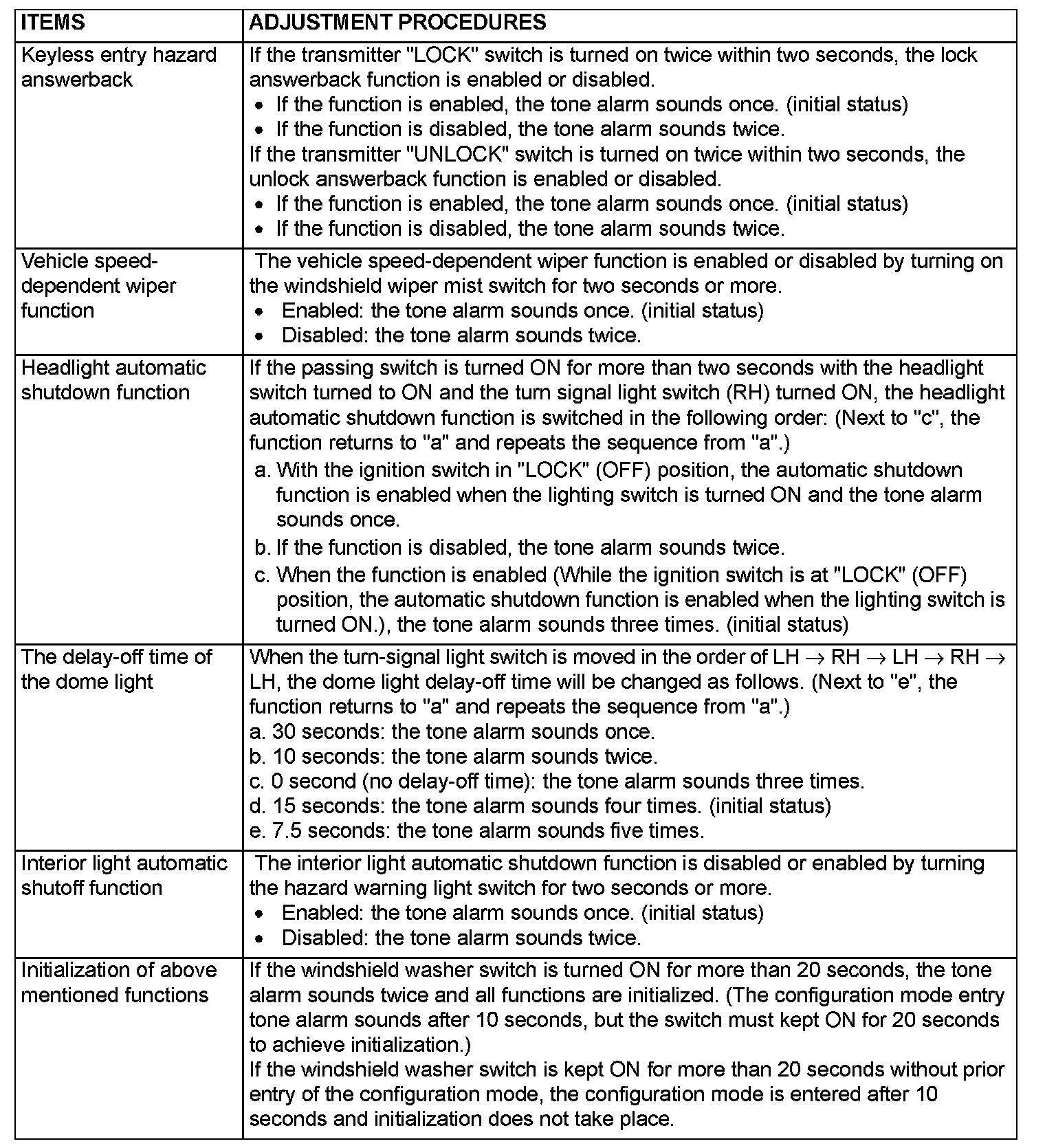 NOTE: The keyless entry hazard answerback can be also adjusted by operating the RKE transmitter. (however, this adjustment can be done more easily by operating the transmitter.) Refer to Keyless Entry System - On-vehicle Service - Enabling/disabling the Answerback Function.