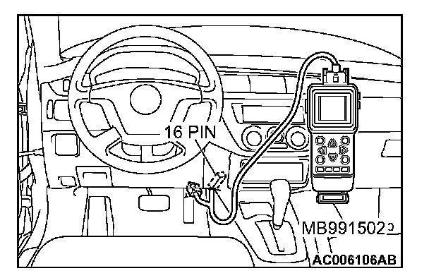 CAUTION: To prevent damage to scan tool MB991502, always turn the ignition switch to the "LOCK" (OFF) position before connecting or disconnecting the scan tool MB991502.