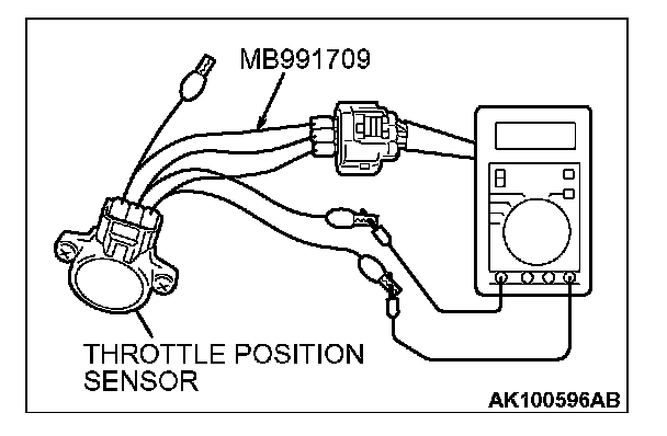 1. Disconnect the throttle position sensor connector, and connect the special tool MB991709 in between. (All terminals should be connected.)