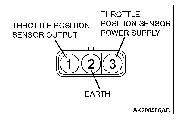 3. Connect an ohmmeter between terminals 2 (ground) and 1 (output), or between terminals 1 (output) and 3 (power). Then, make sure that the resistance changes smoothly when the throttle valve is slowly moved to the fully open position.
