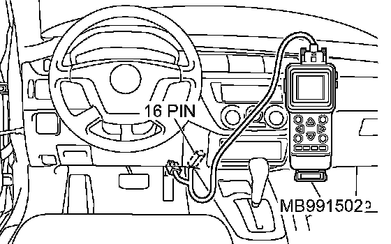 CAUTION: To prevent damage to scan tool MB991502, always turn the ignition switch to the "LOCK" (OFF) position before connecting or disconnecting scan tool MB991502.