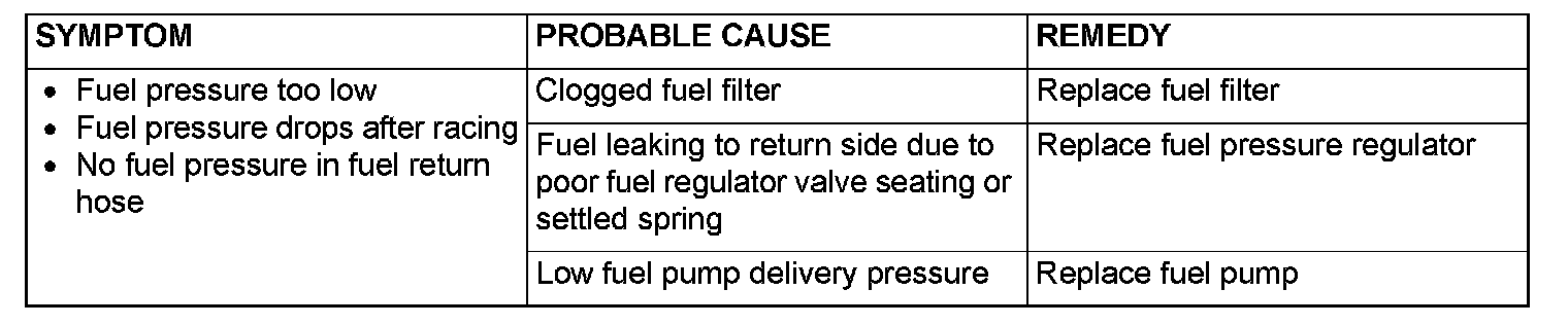 13. Stop the engine and observe fuel pressure gauge reading. It is normal if the reading does not drop within two minutes. If it does, observe the rate of drop and troubleshoot and repair according to the table. Start, then stop the engine.