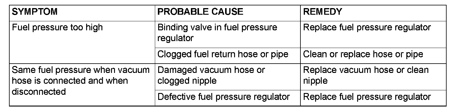 12. If any of fuel pressure measured in steps 10 to 13 is out of specification, troubleshoot and repair according to the table.