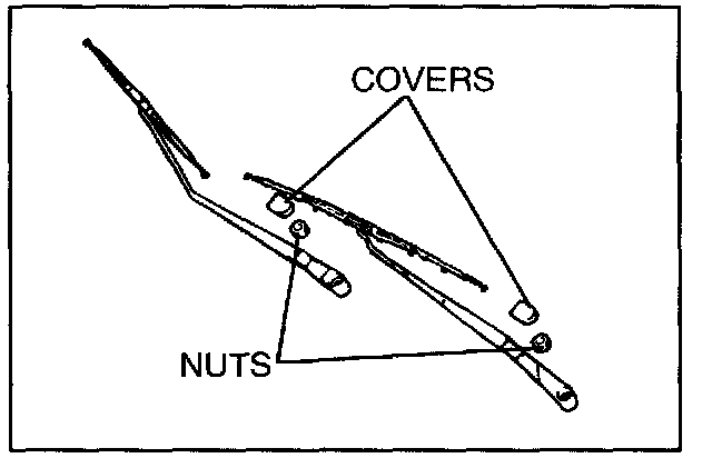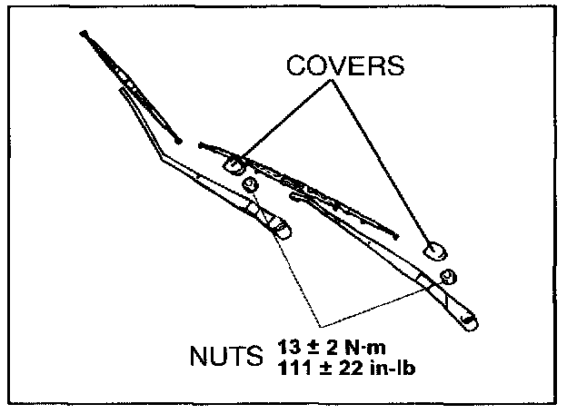 4. Reinstall both wiper blade/wiper arm assemblies. Make sure each wiper arm attachment nut is tightened to the standard value; 13 +/- 2 Nm (111 +/- 22 in-lb). Reinstall the nut covers. Check wipers for proper operation.