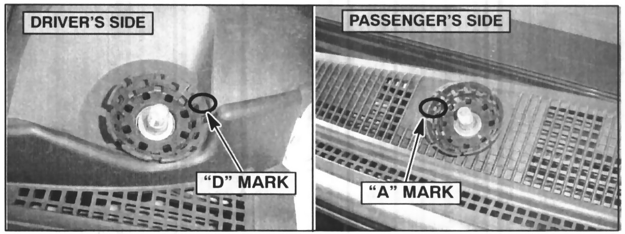 2. Place a new grommet on each wiper pivot shaft. Be sure to put the correct grommet on its shaft. The grommet for the driver's side wiper shaft is marked with a "D". Some passenger's side grommets are marked with an "A" while others may not be have this mark. You can also determine the correct part by looking at the height of the grommet. The passenger's side grommet is the taller of the two and the outside edges rise from the bottom at a steeper angle than the driver's side. See the PARTS INFORMATION section of this bulletin.