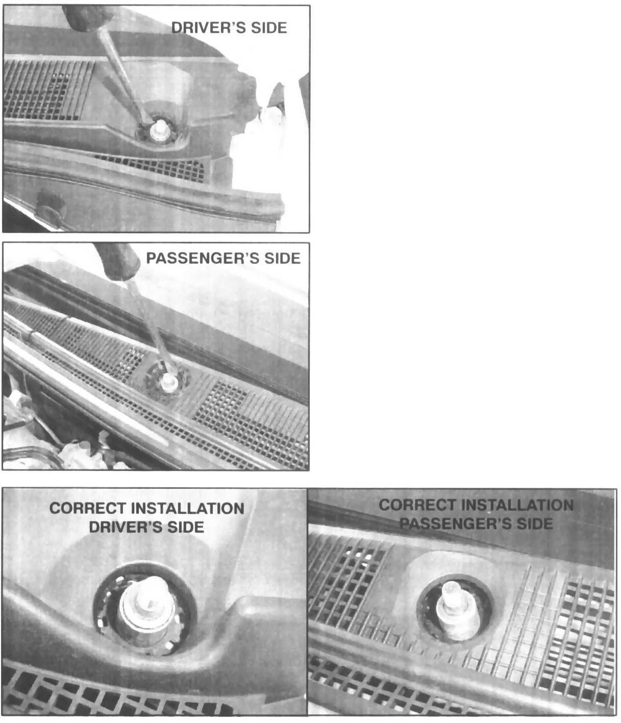 3. Using a flat screwdriver, press the new grommet downward until it slides down and rests completely under the front deck garnish. Repeat for the other side. See the photos for correct installation position.