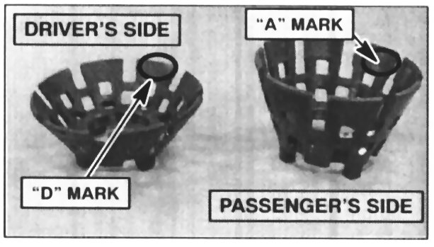 The grommet for the driver's side wiper shaft is marked with a "D". Some passenger's side grommets are marked with an "A" while others may not be have this mark. You can also determine the correct part by looking at the height of the grommet. The passenger's side grommet is the taller of the two and the outside edges rise from the bottom at a steeper angle than the driver's side.