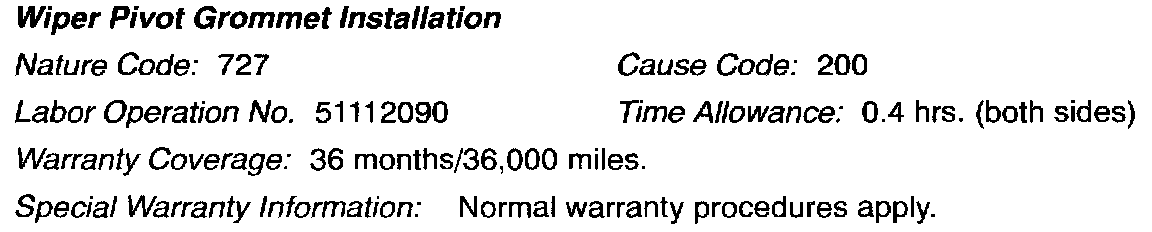 This bulletin contains procedures for installing special wiper pivot caps (grommets) onto the wiper pivot shafts to keep water from entering the blower motor. Water entry can cause blower motor failure.