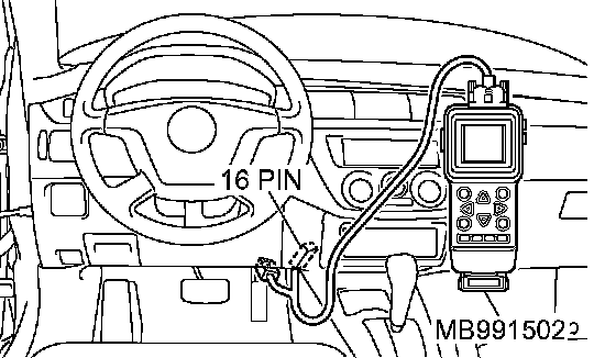 CAUTION: To prevent damage to scan tool MB991502, always turn the ignition switch to the "LOCK" (OFF) position before connecting or disconnecting scan tool MB991502.