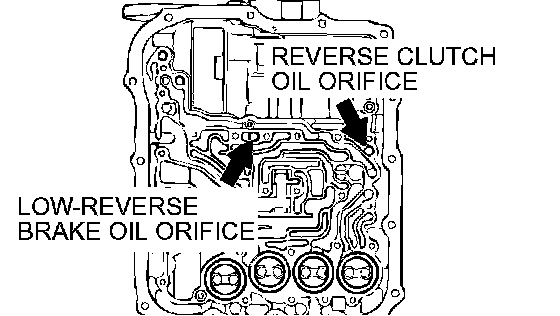 2. Blow 108 kPa (15 psi) compressed air into the reverse clutch oil orifice of the transaxle case, and check if the reverse clutch piston moves and air pressures are maintained in that condition. Repeat for the low-reverse brake.