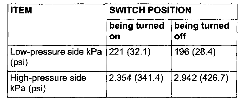3. When the high/low pressure sides of the dual pressure switch are at operation pressure (ON) and there is continuity between the respective terminals.