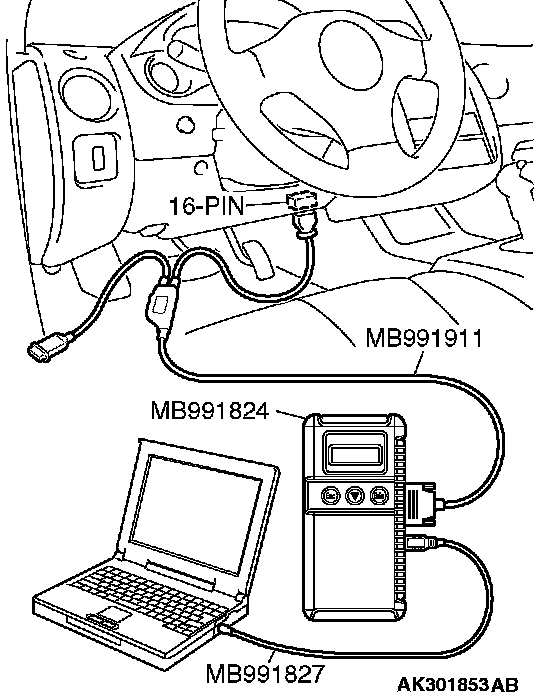 CAUTION: To prevent damage to scan tool MB9911958, always turn the ignition switch to the "LOCK" (OFF) position before connecting or disconnecting scan tool MB9911958.