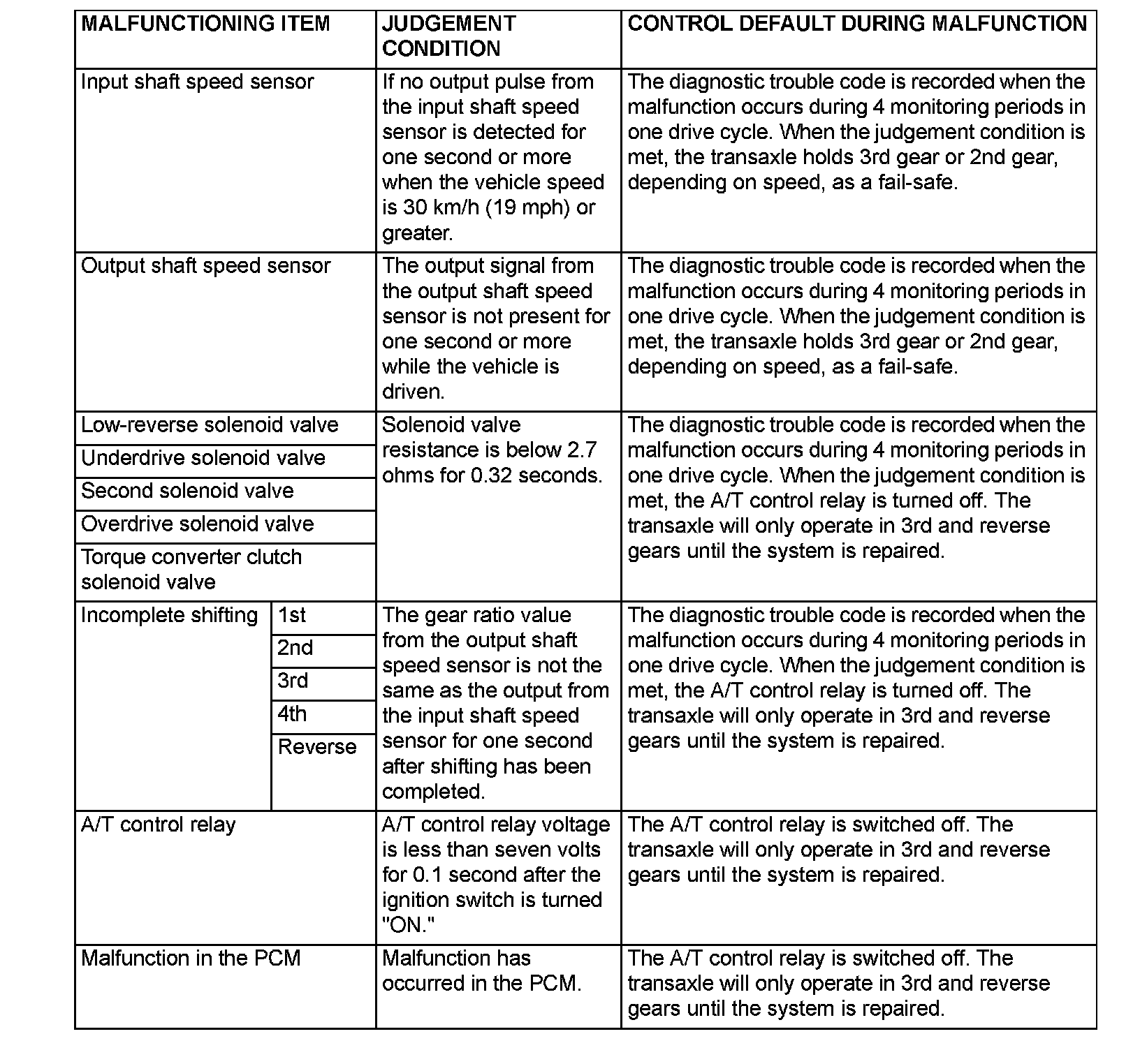 When a malfunction of a main sensor or actuator is detected by the PCM, the transaxle is controlled by pre-set control logic to maintain safe conditions for driving. The following table shows how the fail-safe/backup function affects vehicle driveability and operation.