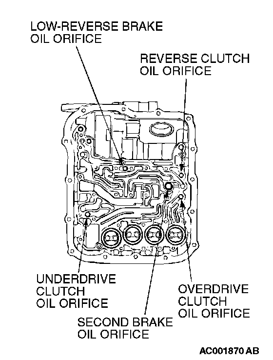 2) Blow 108 kPa (15 psi) compressed air into the each brake oil orifice and clutch oil orifice of the transaxle case, and check if each brake and each clutch piston move and air pressure is maintained.