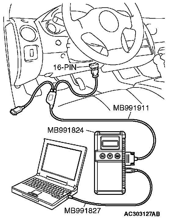 CAUTION: To prevent damage to scan tool MB991958, always turn the ignition switch to the "LOCK" (OFF) position before connecting or disconnecting scan tool MB991958.