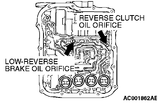 2) Blow 108 kPa (15 psi) compressed air into the reverse clutch oil orifice of the transaxle case, and check if the reverse clutch piston moves and air pressures are maintained in that condition. Repeat for the low-reverse brake.