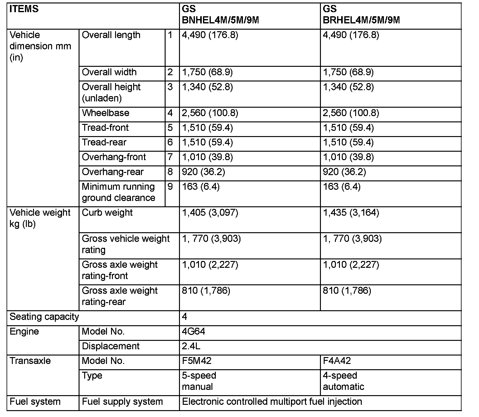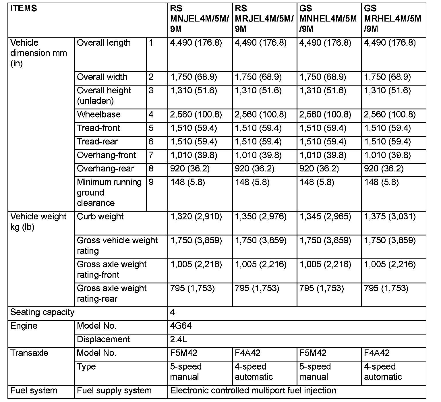 GENERAL SPECIFICATIONS (Model with 2.4L Engine)