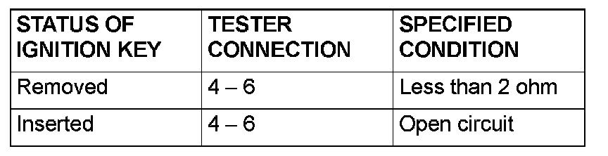 KEY REMINDER SWITCH AND IGNITION KEY RING ANTENNA CONTINUITY CHECK1. Ignition key reminder switch continuity check.