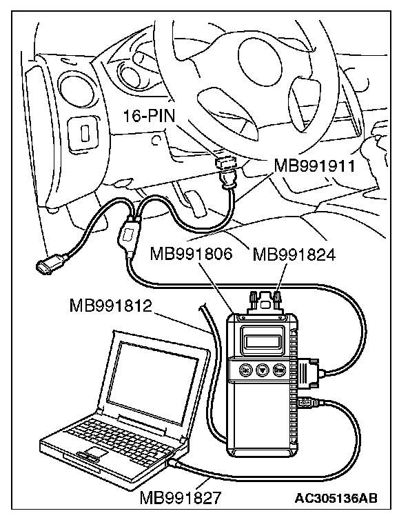 CAUTION: To prevent damage to scan tool MB991958, always turn the ignition switch to the "LOCK" (OFF) position before connecting or disconnecting scan tool MB991958. Connect special tool MB991911 before connecting special tool MB991812. Be sure to connect special tool MB991806 after turning on special tool MB991824.