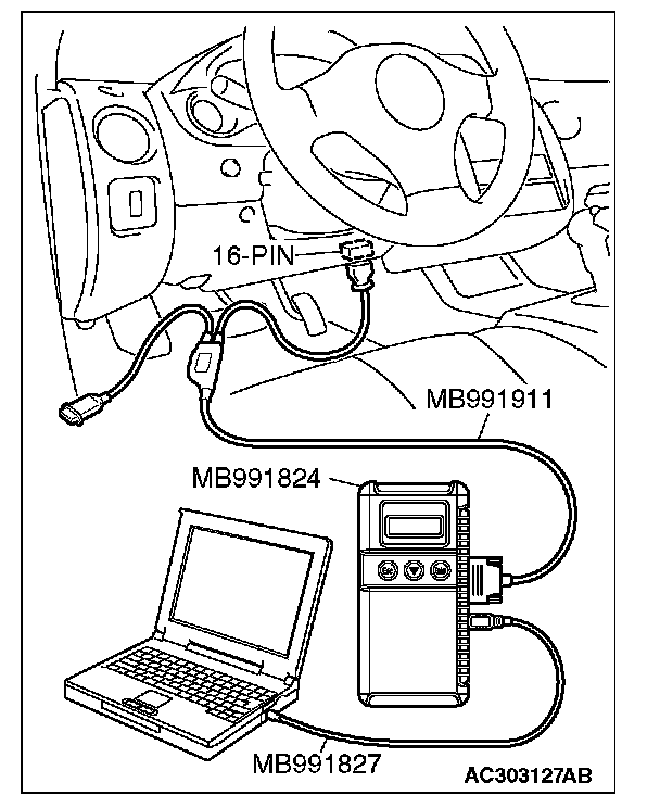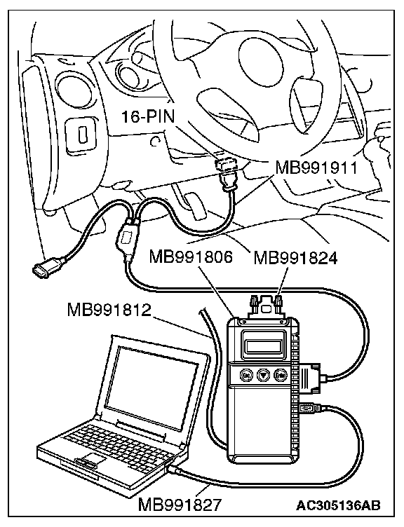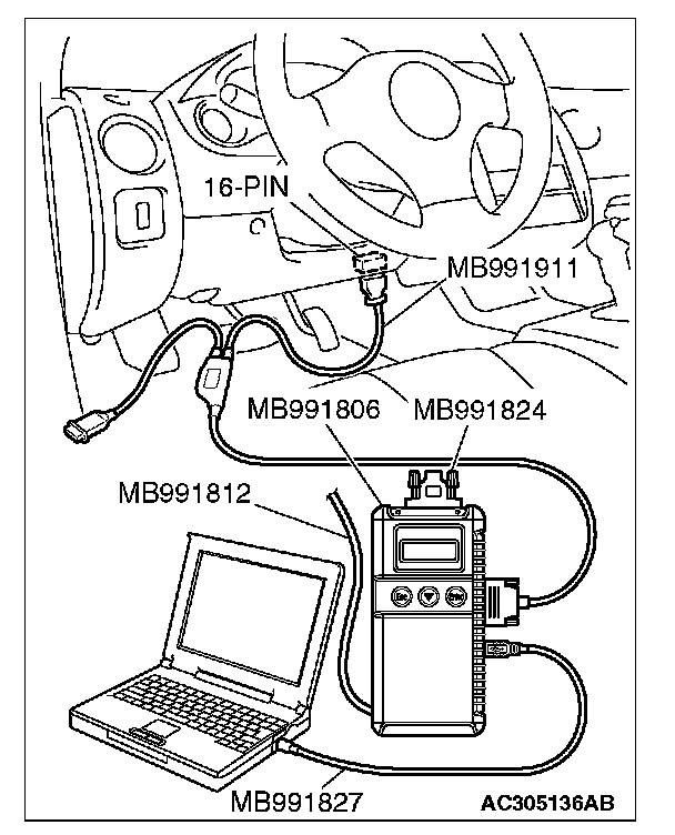 CAUTION: To prevent damage to scan tool MB991958, always turn the ignition switch to the "LOCK" (OFF) position before connecting or disconnecting scan tool MB991958. Connect special tool MB991911 before connecting special tool MB991812. Be sure to connect special tool MB991806 after turning on special tool MB991824.