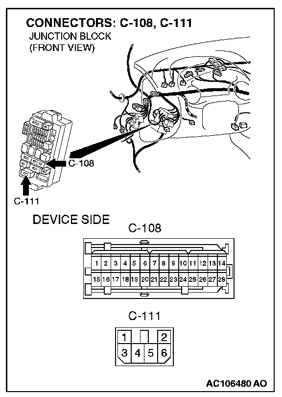 NOTE: Also check junction block connectors C-108 and C-111. If junction block connector C-108 or C-111 is damaged, repair or replace the connector as described in Harness Connector Inspection.