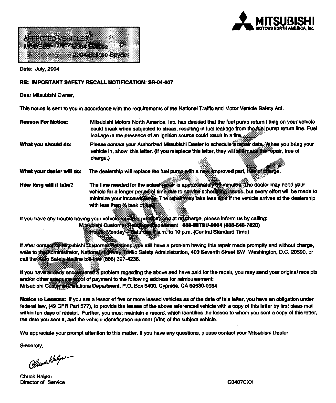 Mitsubishi dealer to have the fuel pump replaced. A copy of the customer notification letter is included in this bulletin.