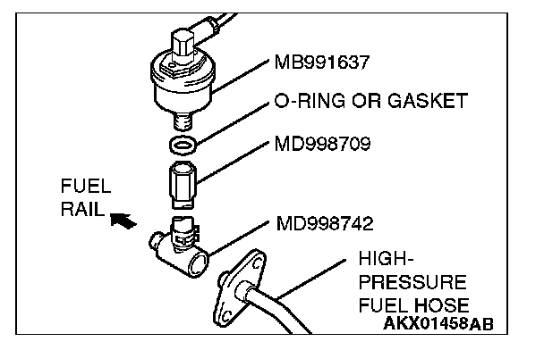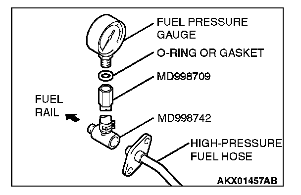 2. Place a suitable O-ring or gasket on the assembled special tools MD998709 and MD998742 and install the fuel pressure gauge.