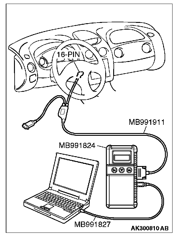 CAUTION: To prevent damage to scan tool MB991958, always turn the ignition switch to the "LOCK" (OFF) position before connecting or disconnecting scan tool MB991958.