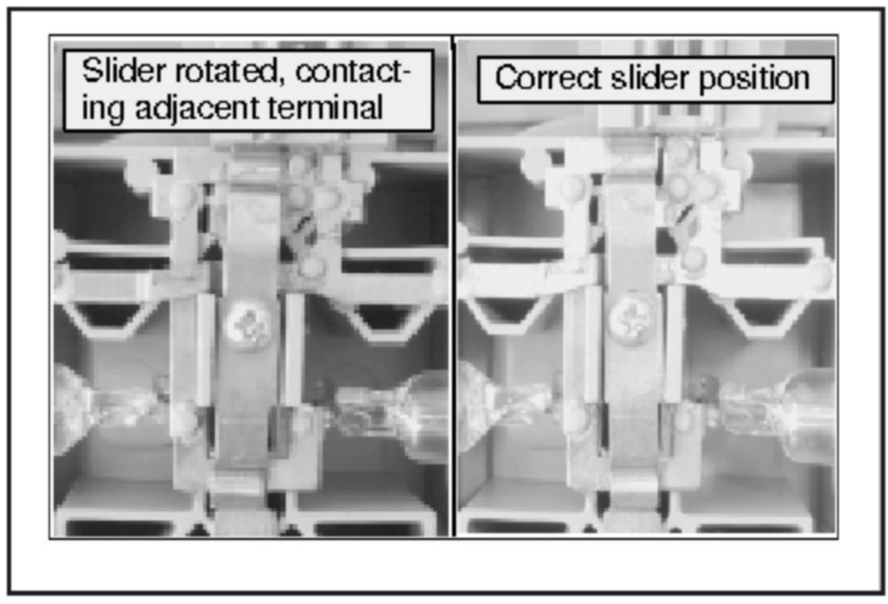 2. Inspect the position of the dome light switch slider bar with the switch in the OFF position (see photo). The screw securing the switch slider may come loose, allowing the slider to rotate and contact the adjacent terminal.