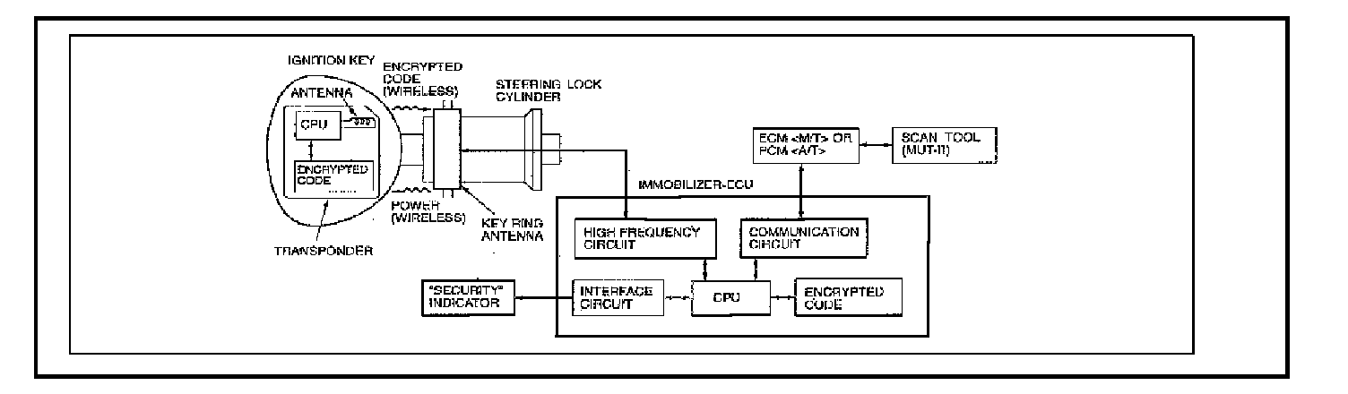 Introduced during the 2000 model year, the "Anti-theft engine immobilizer with security keys" is designed to significantly reduce the possibility of car theft. The system immobilizes the vehicle if an invalid start is attempted. A valid start can only be accomplished (subject to certain conditions) by using a special transponder key "registered" to the ignition switch lock. For complete system description and operation summary, refer to the service manual for any of the listed affected vehicles.