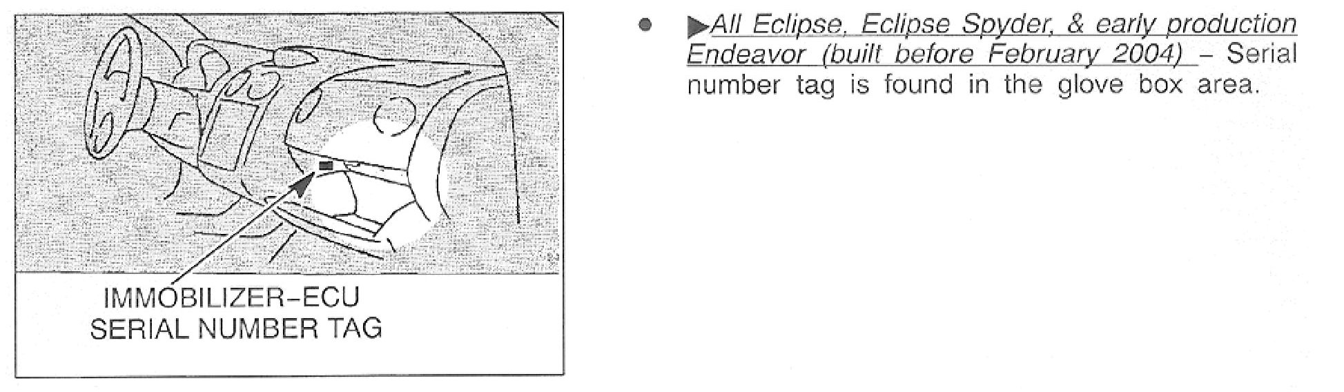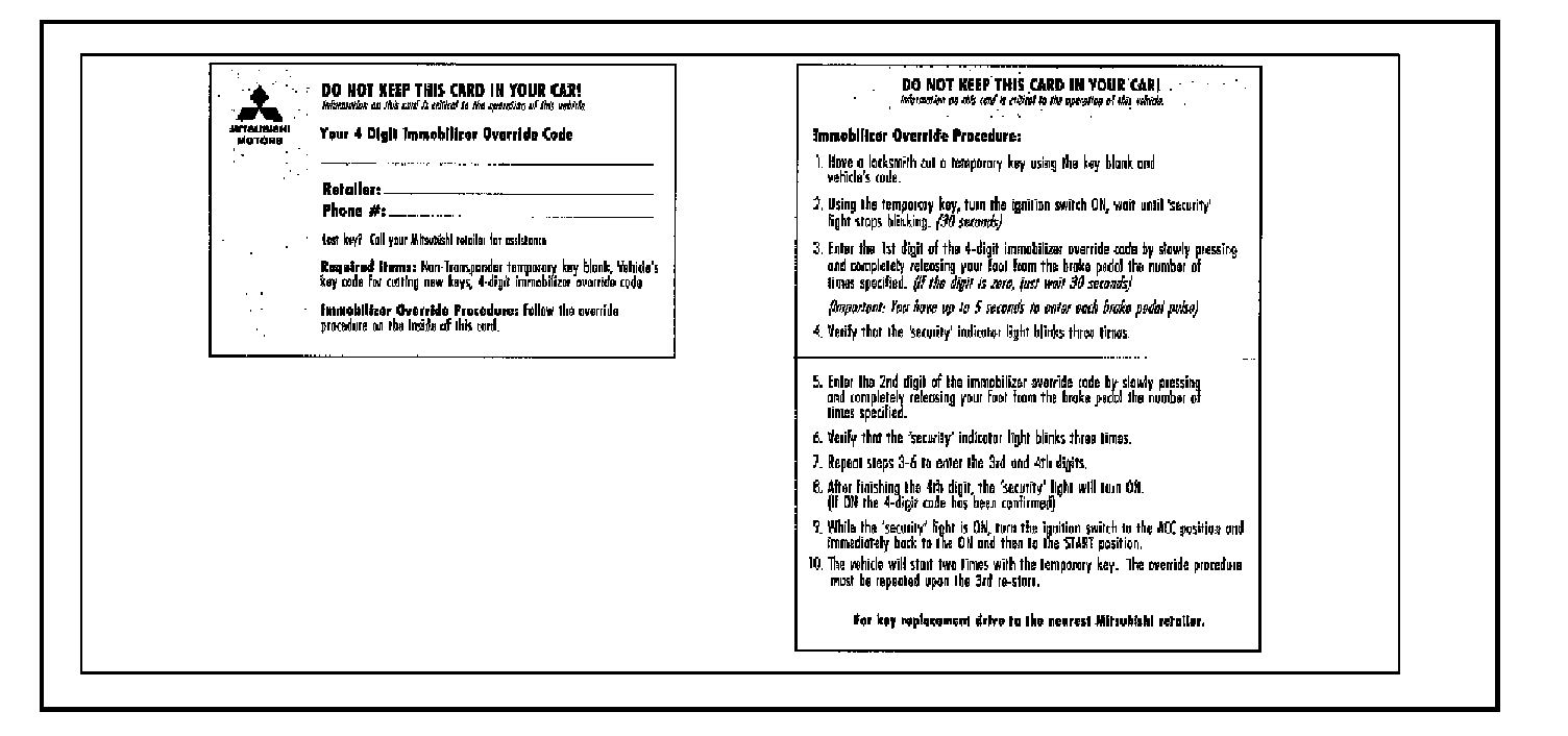 For procedures for starting the engine with a non-transponder key using the Immobilizer Override Code, refer to the customer information card included in the glove box of each immobilizer equipped vehicle. The card is shown on the previous page of this bulletin. If this card is unavailable, refer to the Immobilizer Override Procedures in TSB-03-54-007 for 2003 model year vehicles. The 2004 Eclipse, Eclipse Spyder, and early production 2004 Endeavor immobilizer system's override function is the same as the 2003 model year system.