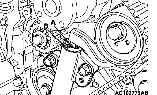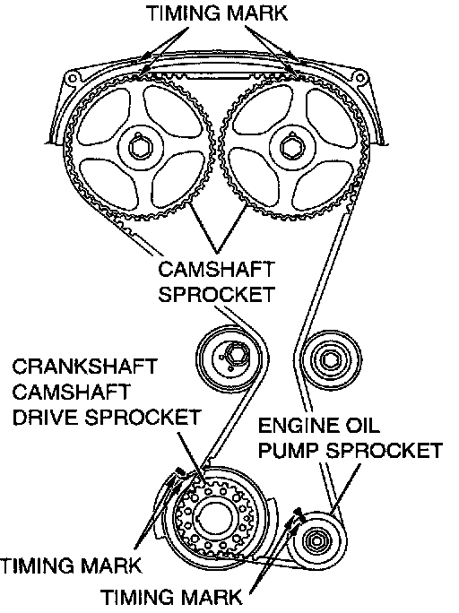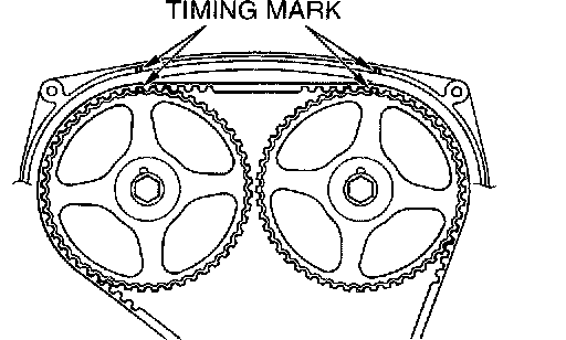 CAUTION: Install the valve timing belt. Then apply reverse rotation (counterclockwise rotation) pressure to the cam shaft sprocket. Re-check to see that each timing mark is aligned while the tension side of the belt is tight.