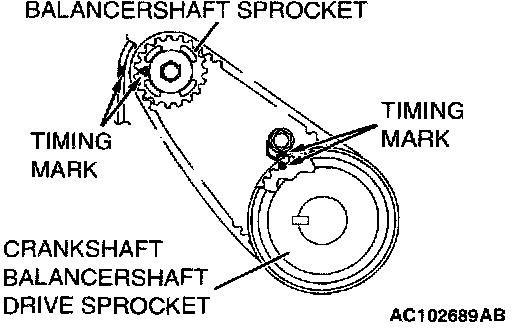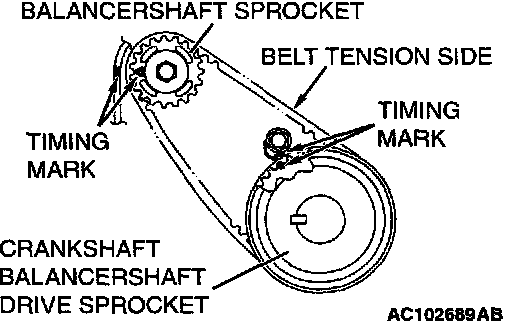 2. Install the balancer timing belt on the crankshaft balancer shaft drive sprocket and balancer shaft sprocket. There should be no slack on the tension side.