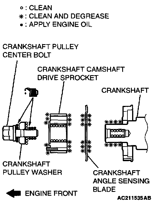 1. Clean or degrease the crankshaft, the crankshaft angle sensing blade, the crankshaft camshaft drive sprocket and crankshaft pulley washer as shown.