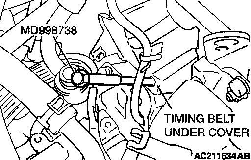 CAUTION: The special tool MD998738 can be gradually installed at a rate of a 30 degree turn per second. If it is screwed in all at once, the timing belt tensioner adjuster rod will not easily retract and the special tool MD998738 may bend.