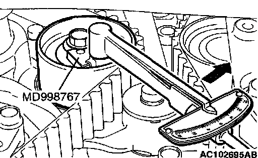 4. Turn the timing belt tensioner in the direction shown using special tool MD998767 to apply tension to the valve timing belt. Then pre-tighten the timing belt tensioner pulley.