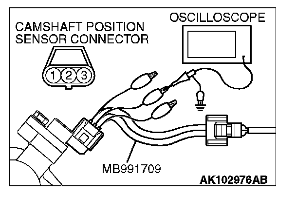 1. Disconnect the camshaft position sensor connector, and connect the test harness special tool (MB991709) in between. (All terminals should be connected.)