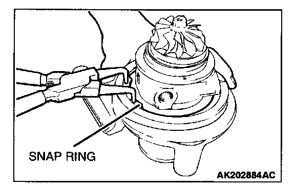 CAUTION: Hold the snap ring with your fingers during its removal to prevent it from springing away. Remove the compressor cover retaining snap ring using a snap ring pliers.